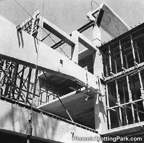The Phoenix Trotting Park was truly a marvel of construction engineering. The massive building is 500 feet long (152.4 meters) by 195 feet wide (59.4 meters) by 86 feet tall (26.2 meters). The facility was constructed in 1964 and took less than a year to build. The rapid construction was possible due to the extensive use of pre-cast, post-tensioned concrete members that were assembled together like a giant three-dimensional puzzle. More than 3,000 pre-cast pieces were used in the project. The grandstand and race track sit on a huge 640 acre parcel of land.