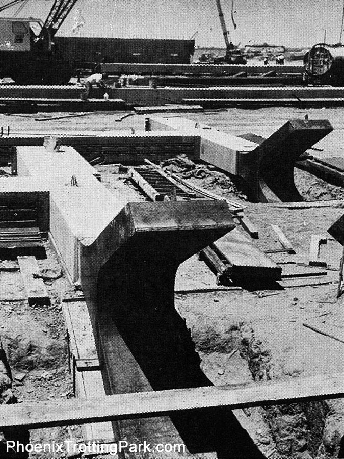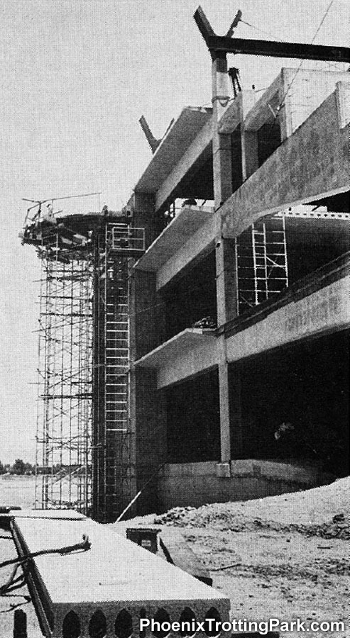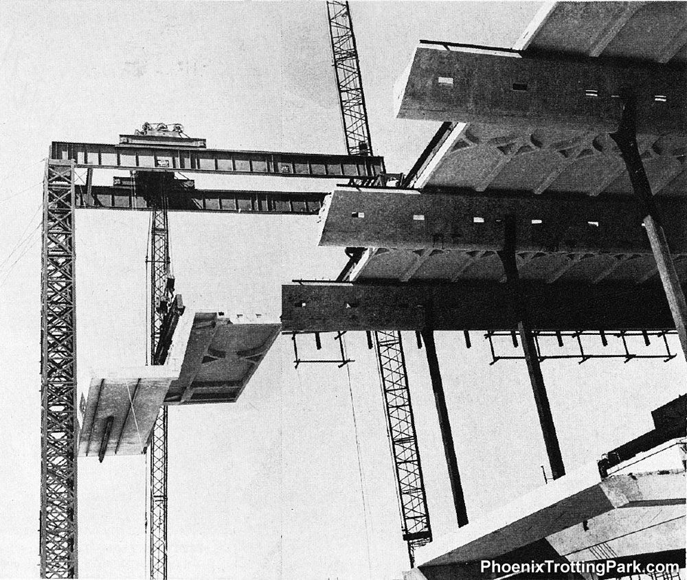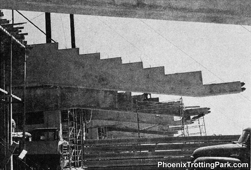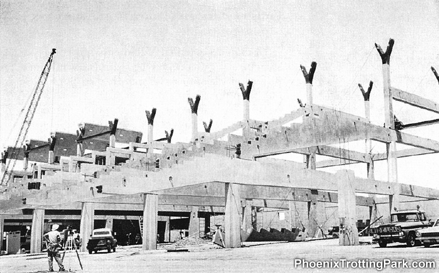 The Phoenix Trotting Park was truly a marvel of construction engineering. The massive building is 500 feet long (152.4 meters) by 195 feet wide (59.4 meters) by 86 feet tall (26.2 meters). The facility was constructed in 1964 and took less than a year to build. The rapid construction was possible due to the extensive use of pre-cast, post-tensioned concrete members that were assembled together like a giant three-dimensional puzzle. More than 3,000 pre-cast pieces were used in the project. The grandstand and race track sit on a huge 640 acre parcel of land.